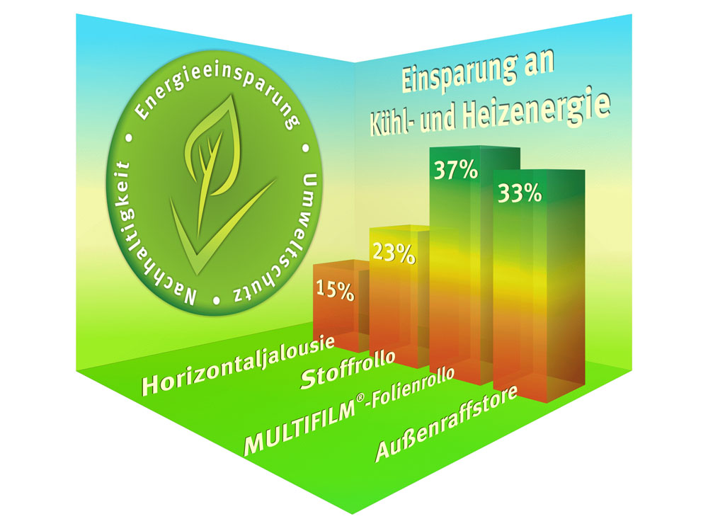 Mit Folienrollos von MULTIFILM® funktioniert die Energieeinsparung am Fenster. Das Ergebnis: stets angenehme Raumtemperaturen, verzögertes Aufheizen der Räume und ein geringerer Kühlenergiebedarf. Im Winter wirken die Folienrollos der Auskühlung der Räume entgegen.