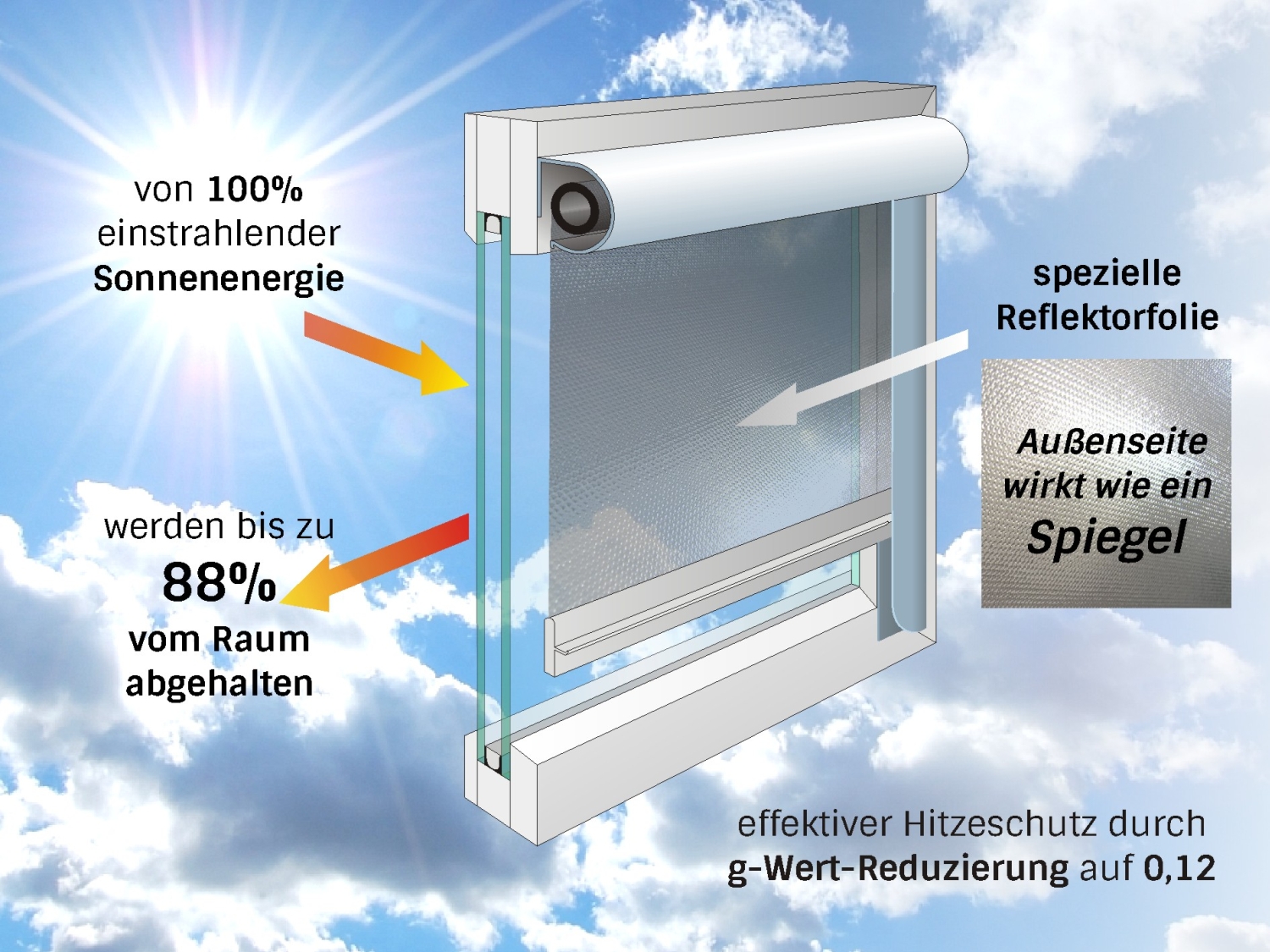 "Herzstück" der Rollos ist eine Polysterfolie mit aluminiumbeschichteter Außenseite. Diese wirkt wie ein Spiegel und reflektiert die auftreffende Sonnenenergie sofort zurück ins Freie, bevor sie sich im Raum in Wärme umwandeln kann.Das Ergebnis: