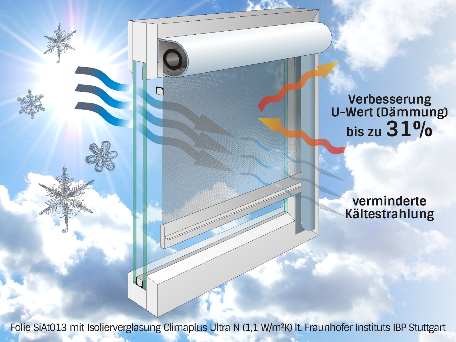 (Folie SiAt013 mit Isolierverglasung Climaplus Ultra N (1,1 W/m²K) lt. Fraunhofer Institut IBP Stuttgart)